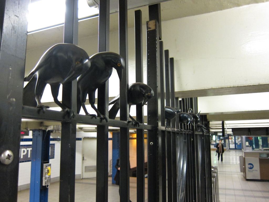We got off at the Canal Street Station (due to subway repairs being done over the weekend- limited service) where we found these beautiful blackbirds decorating the iron fencing forming the exit. The work is named "The Gathering" and it was done by Walter Martin and Paloma Munoz (for all kinds of great info on art in the NYC subways check out their website (this photo was taken by Conrad Trautmann)